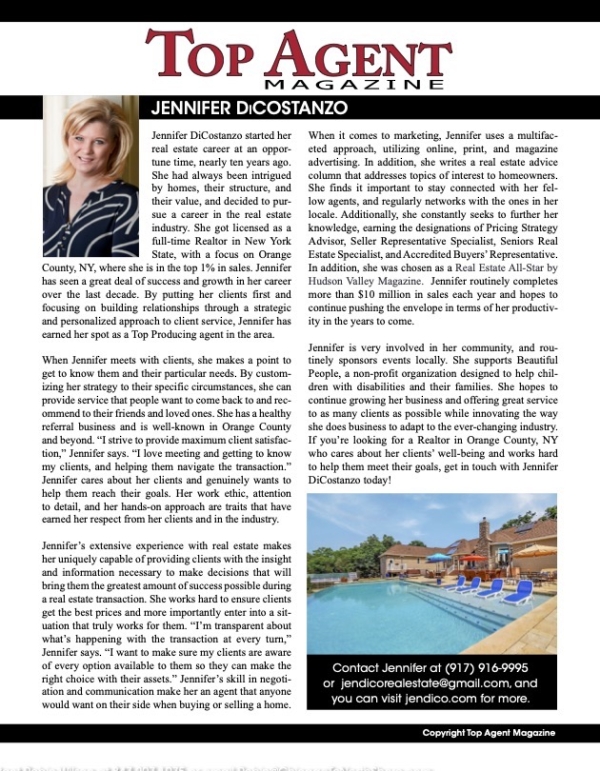 Orange County, New York real estate agent Jennifer DiCostanzo has been featured in Top Agent Magazine for achievements in her field. Top Agent is the premier real estate magazine, featuring the best real estate agents in the country, as well as across the globe.